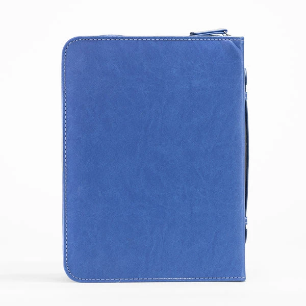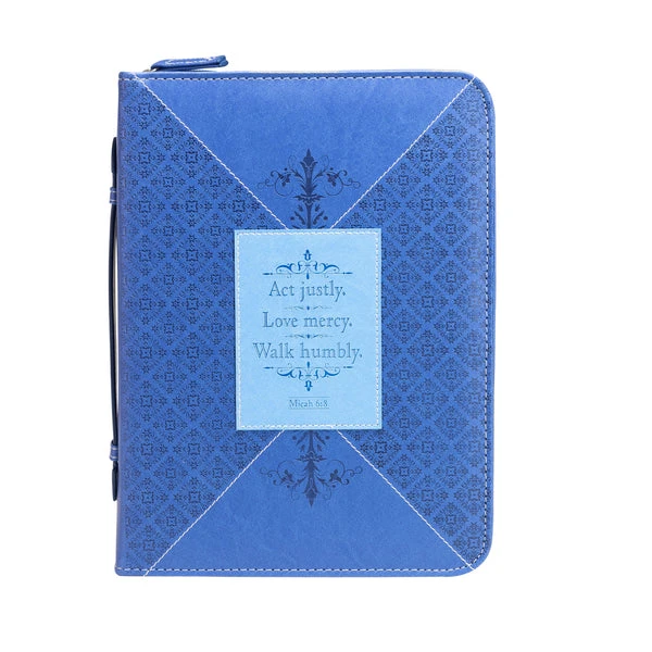 Act Justly Love Mercy Walk Wrap Patch Bible Cover features wrap patch design and sentiment reading “Act justly, love mercy, walk humbly. Micah 6:8″Cover is made of polyurethane faux leather with blue finishBible cover is size large and measures approximately 10 x 7 x 2 inchesEmbellished with applique and hot stamp features; Includes zippered closure and spine carrying handle