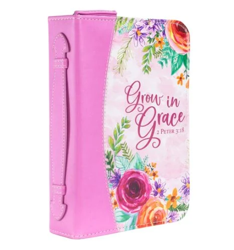 Embellished with applique design and heat-stamped Scripture quote Wrap-around zip closure Textured faux leather Elegant design for her Pink with colorful