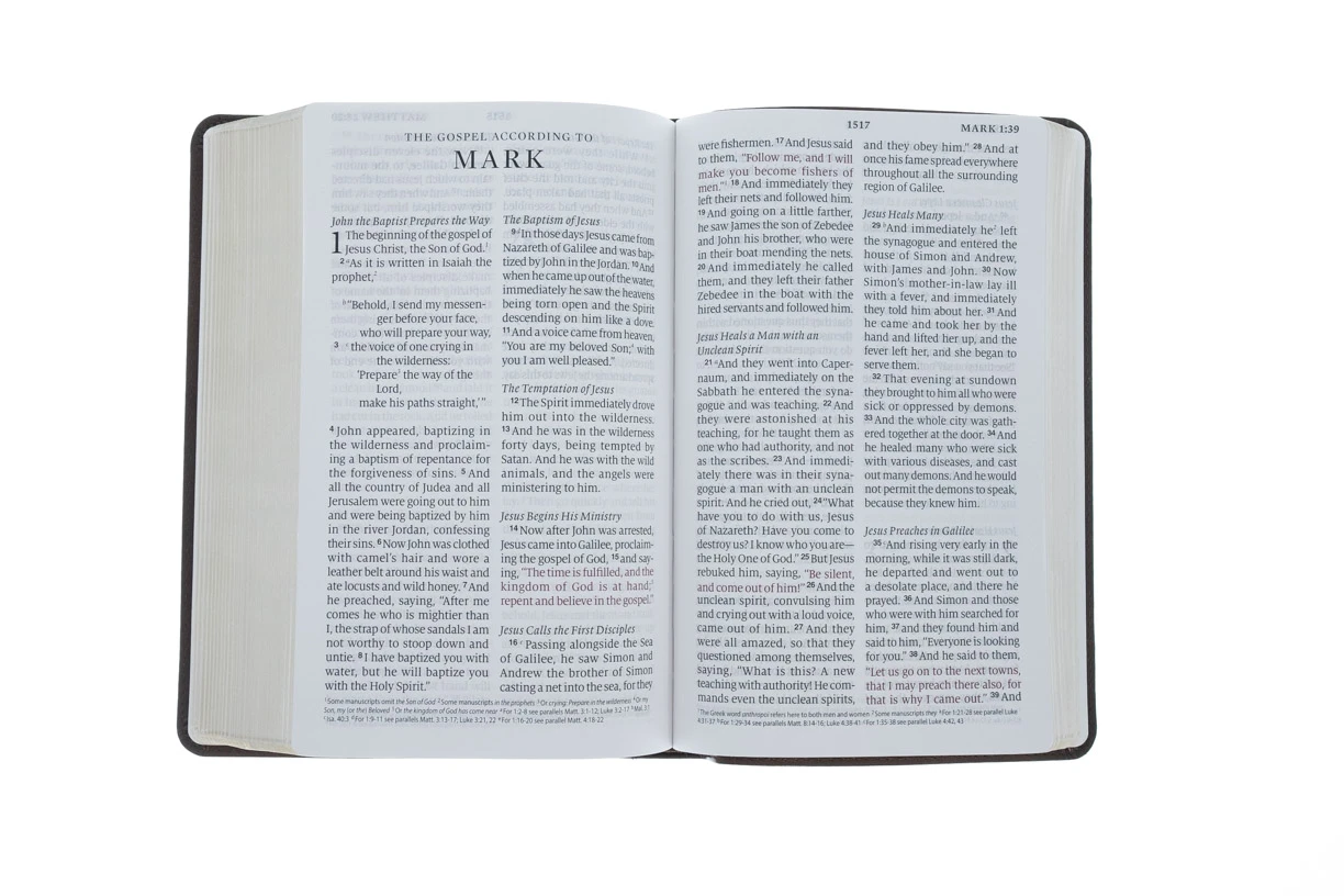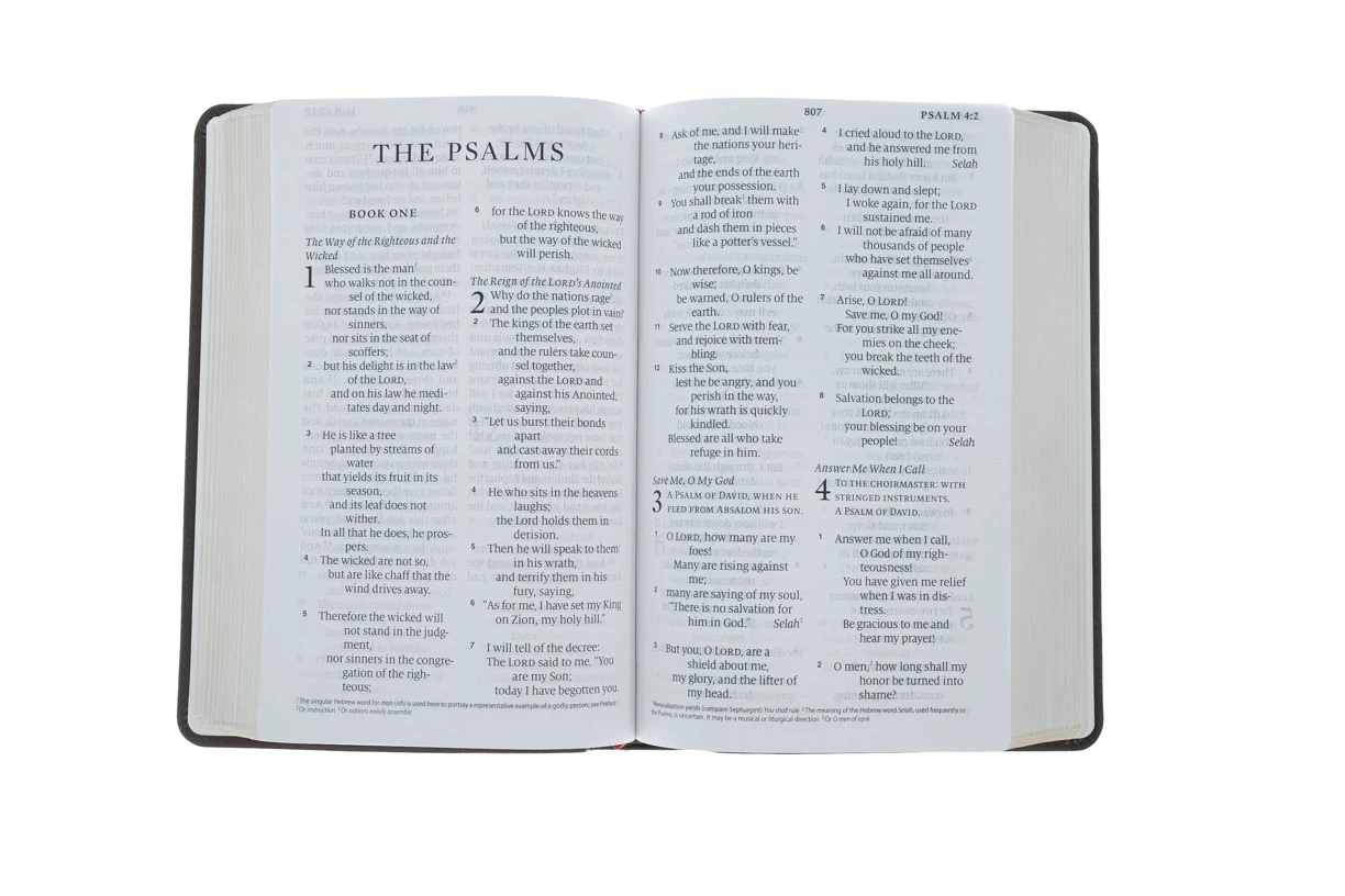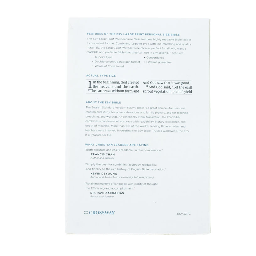 The ESV Large Print Personal Size Bible features highly readable Bible text in a convenient format. Combining 12-point type with line-matching and quality