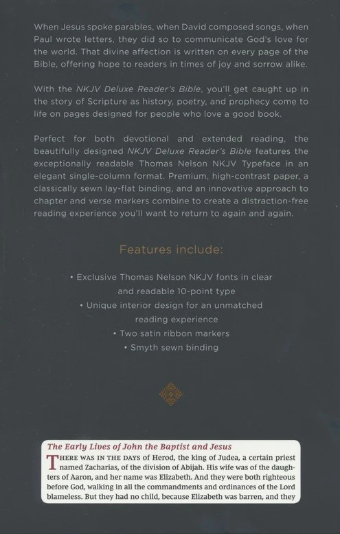 The NKJV Deluxe Reader’s Bible is an invitation to get caught up in the story of Scripture, as history, poetry, and prophecy come to life on pages