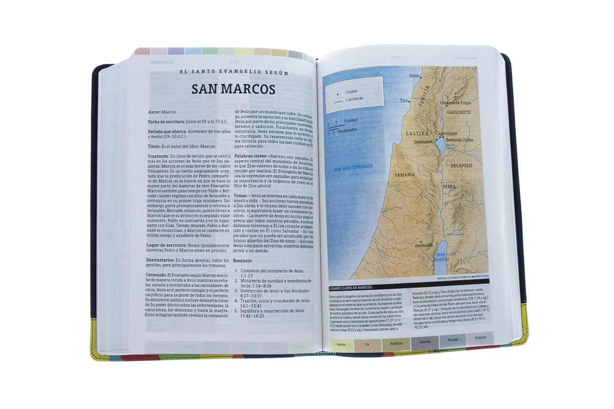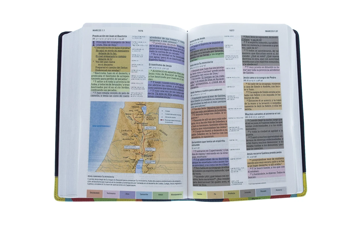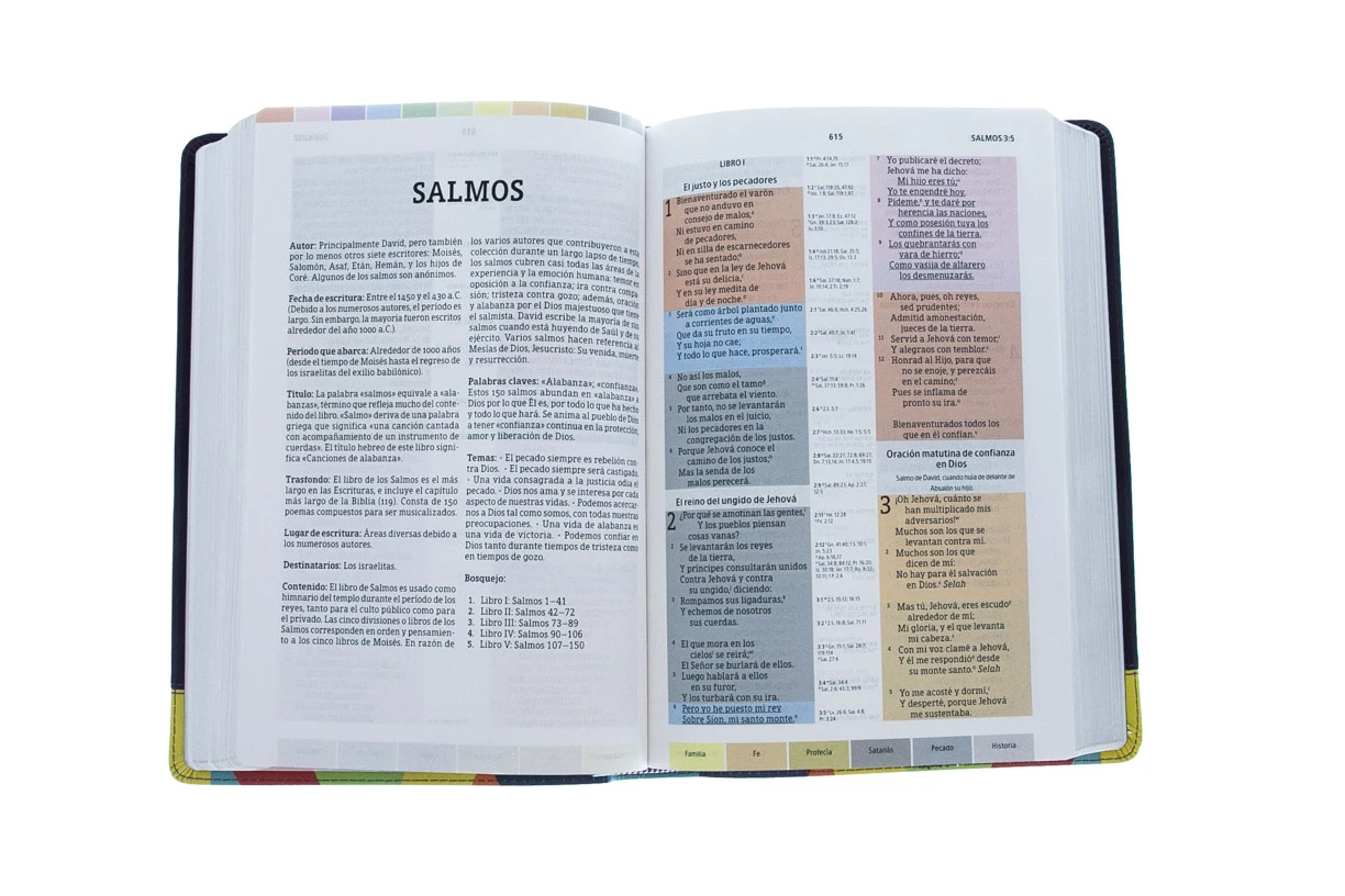 La Biblia de Estudio Arcoiris Reina Valera 1960 cuenta con un sistema único de «código de colores» que le permite al lector de manera fácil y rápida