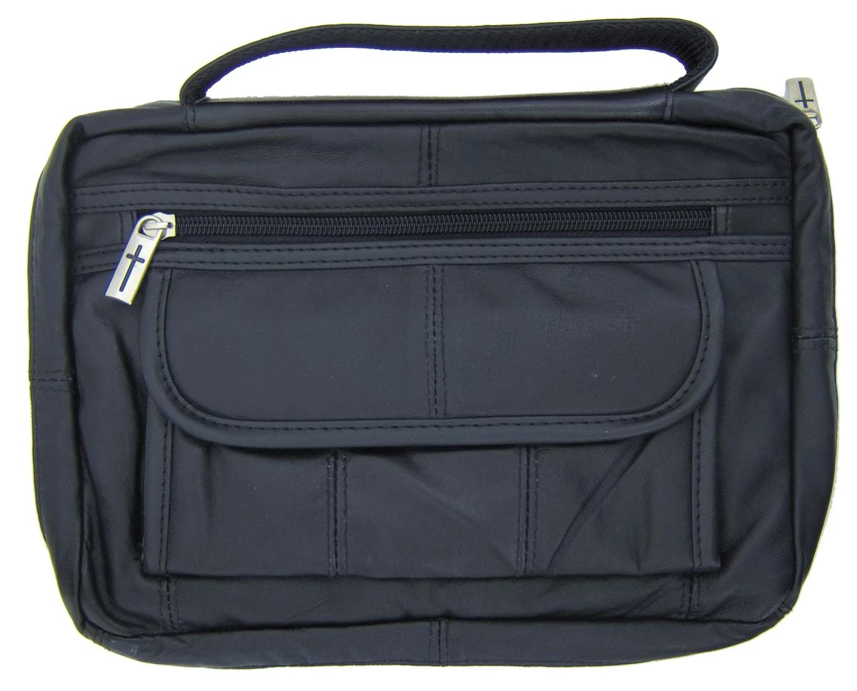Black leather Bible cover features a zippered main pocket, hand strap, self-closing front pocket, and additional zippered front pocket with cross zipper-pull. Pen holder on inside.