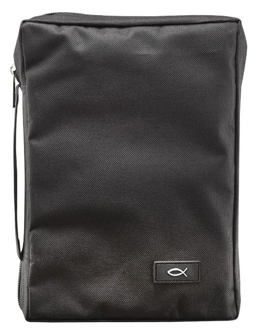 Large: Fits most standard size Bibles and books up to 6 5/8″ x 9 1/2″ x 2″Back Slip PocketCross Engraved Zipper-PullCarry HandleInterior Zipped Mesh Pocket
