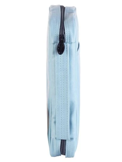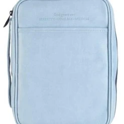 Soft light blue vinyl Bible cover is imprinted with the words “God grant me Serenity Courage Wisdom” from the Serenity Prayer. Features a large open