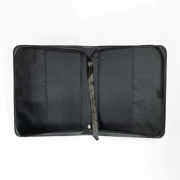 Scripture quote from Proverbs 3:5 featured on faux leather Bible coverBlack and metallic silver with debossed scrollworkConvenient spine handle and wrap zipperFits Bibles up to 9.25″ x 6.5″ x 2″Embellished with applique and hot stamp featuresZippered closure and spine carrying handleCover features scripture: “Trust in the Lord Forever.” -Proverbs 3: 5