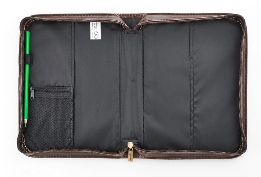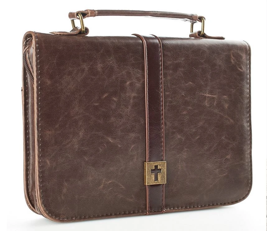 The front and back covers of the brown faux leather Bible cover is designed to mimic a rugged worn-and-torn look. A smooth, deeper brown belting strip
