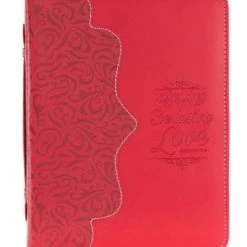 Scripture quote from Jeremiah 31:3 is debossed on faux leather Bible coverScroll pattern designI have loved you with an everlasting love.RedConvenient spine handle and wrap zipperArtisan font designFits Bibles up to 8.25″ x 5.5″ x 1.75
