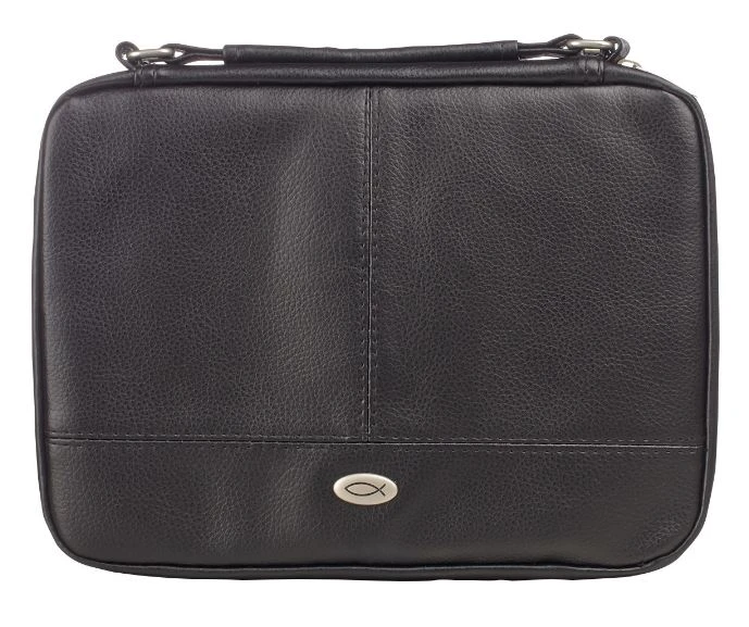 The Two-Fold Bible / Book Case makes a handsome organizer for Bible studies. The added fold provides extra interior storage: card organizer, zipped mesh pocket, slip pocket, 5 pen loops and a notepad slot. (A notepad and pen/marker are included.) There is an exterior zipper with a cross engraved zipper-pull, a convenient, comfortable handle and a metal fish emblem. The Bible organizer is constructed of quality man-made material imported from Italy, with the look and feel of real leather (trade name LuxLeather).