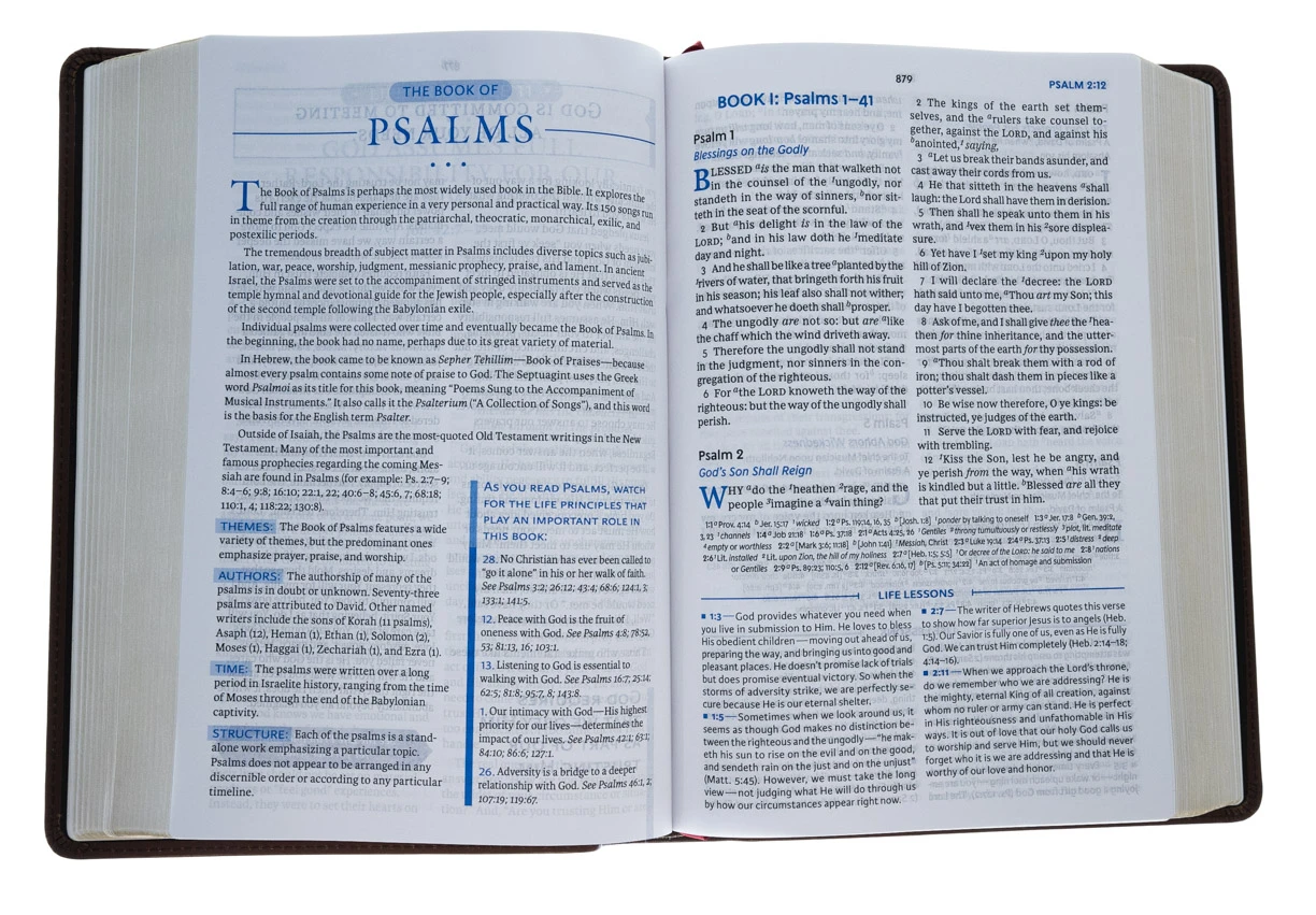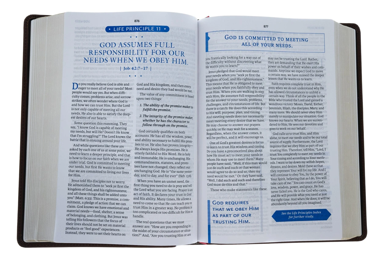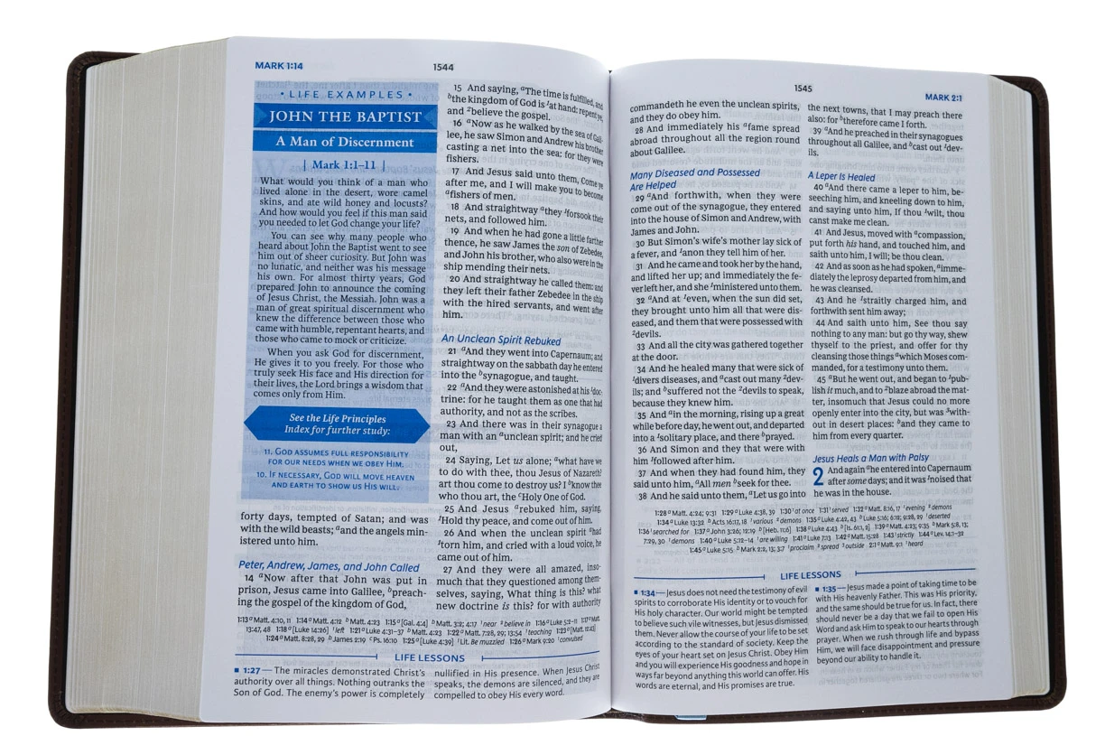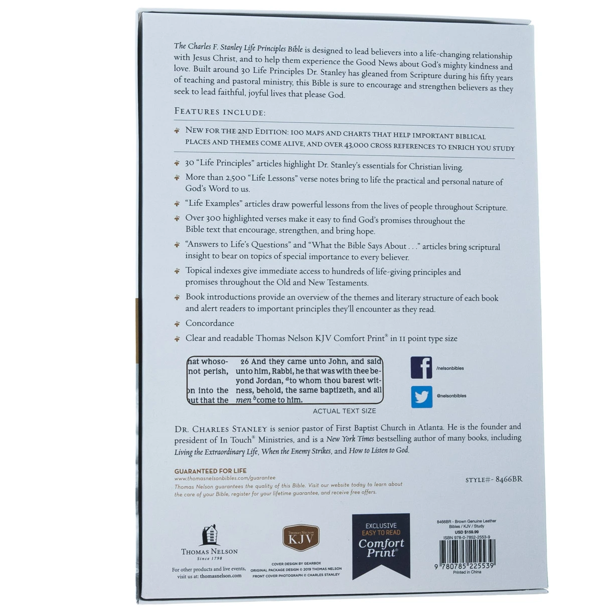 The Charles F. Stanley Life Principles Bible is designed to lead believers into a life-changing relationship with Jesus Christ, and to help them experience the Good News about God’s mighty kindness and love. Built around 30 Life Principles Dr. Stanley has gleaned from Scripture during his fifty years of teaching and pastoral ministry, this Bible is sure to encourage and strengthen believers as they seek to lead faithful, joyful lives that please God.With over one million Life Principles Bibles sold to date, the updated second edition is the best way to experience this bestselling classic—with a completely new design featuring Thomas Nelson’s KJV easy-to-read Comfort Print® typeface, 100 specially designed maps and charts that bring biblical places and themes to life, and over 43,000 cross references to enrich your study of the Word.Features include:30 Life Principles articles highlight Dr. Stanley’s essentials for Christian livingMore than 2,500 Life Lessons verse notes bring to life the practical and personal nature of God’s Word to usLife Examples articles draw powerful lessons from the lives of people throughout ScriptureOver 300 highlighted verses make it easy to find God’s promises throughout the Bible text that encourage, strengthen, and bring hopeAnswers to Life’s Questions and What the Bible Says About articles bring scriptural insight to bear on topics of special importance to every believerTopical indexes give immediate access to hundreds of life-giving principles and promises throughout the Old and New TestamentsBook introductions provide an overview of the themes and literary structure of each book, and alert readers to important principles they’ll encounter as they readNew for the 2nd Edition, 100 maps and charts that help important biblical places and themes come alive, and over 43,000 cross references to enrich your studyConcordanceClear and readable Thomas Nelson KJV Comfort Print® typeface11-point print size