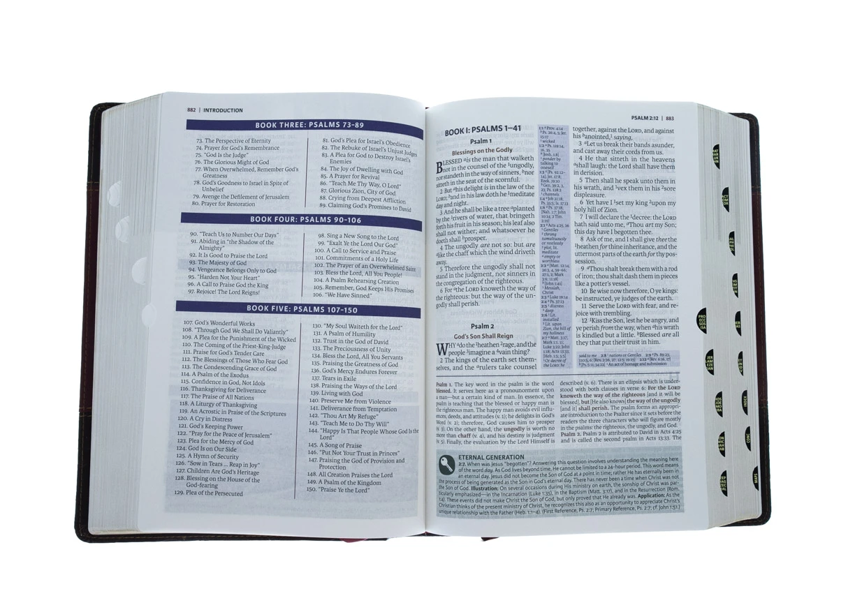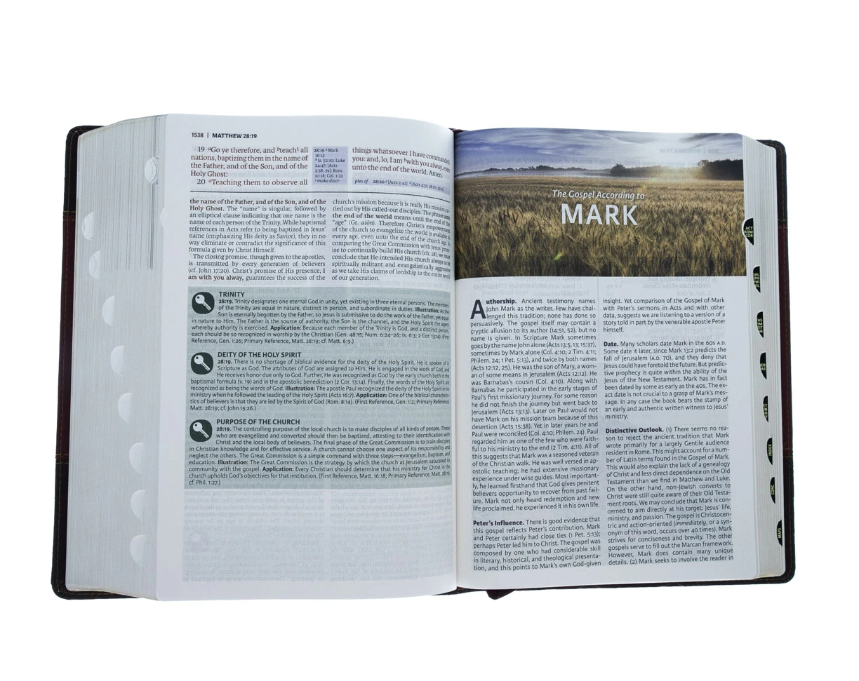The King James Study Bible, Full-Color Edition is the most complete and comprehensive KJV study Bible available. Comprehensive book introductions, doctrinal articles, study notes, commentaries, personality profiles, word studies, and archaeological insights will help you experience the riches of God’s Word. The full-color design, Holy Land images, classic works of art, charts, and maps further enhance your Bible reading experience. With all these features, plus special subject indexes, Christ’s words in red, and an extensive concordance, no other KJV Bible offers more to students of the Holy Bible.Features include:Time-honored KJV Bible textCenter-column references with translation notesBeautiful full-color pages and featuresHundreds of full-color maps, images, and charts5,700 authoritative and time-tested study notesOver 100 archaeological notesOver 100 Personality Profiles highlighting important figures in ScriptureMore than 200 notes on important Christian doctrinesBook introductions and outlinesIndexes and word-study concordance