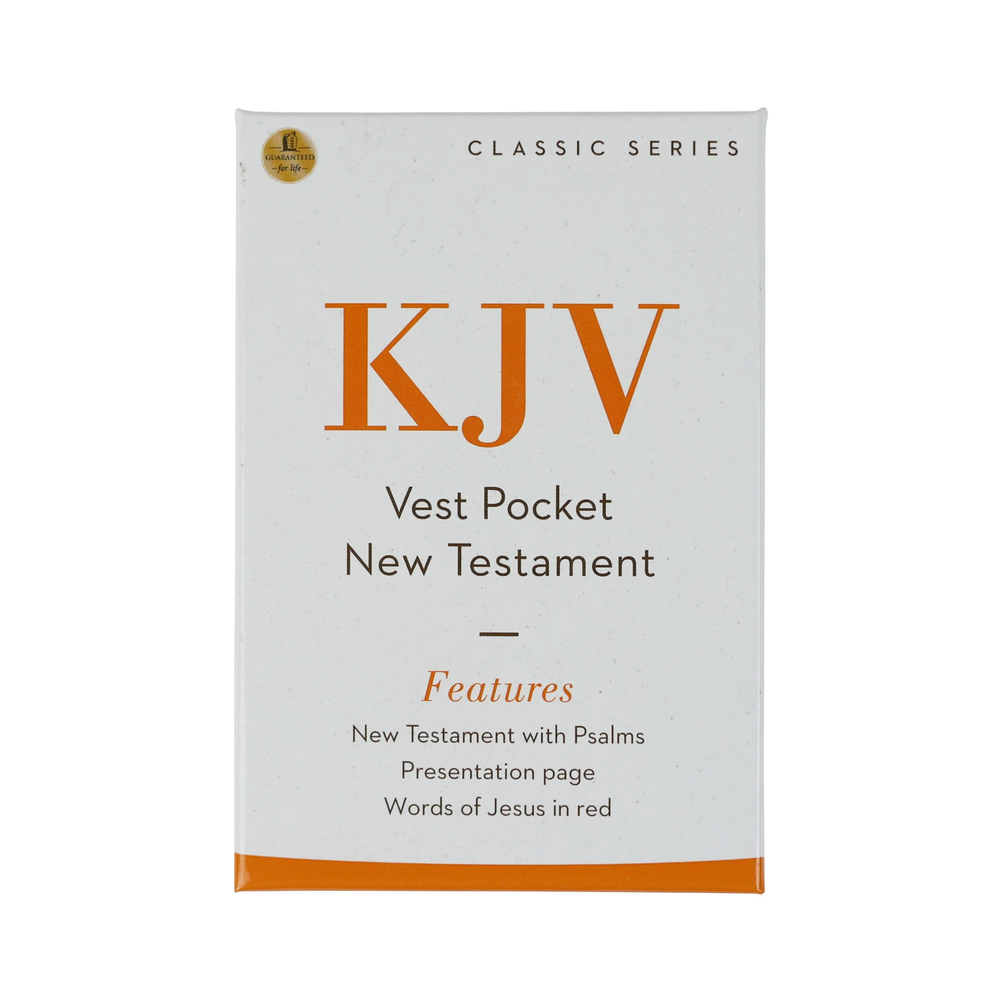 This classic King James New Testament with Psalms is a favorite choice for briefcase, purse, or pocket. Ideal for taking with you wherever you go or for children. Words of Christ in red. Thomas Nelson’s KJV Vest Pocket New Testament and Psalms is as easy to read as it is to carry! Traveling with God’s Word has never been so effortless. The unique size makes this Bible portable enough to fit in a purse, suitcase, backpack, briefcase, or even a pocket. A great gift idea and perfect traveling companion for today’s busy Christian, this compact New Testament with Psalms allows you to read and share God’s Word no matter where you go. Features include: Presentation page Top-of-page subject headings Self-pronouncing text Words of Jesus in red Type size: 6 point