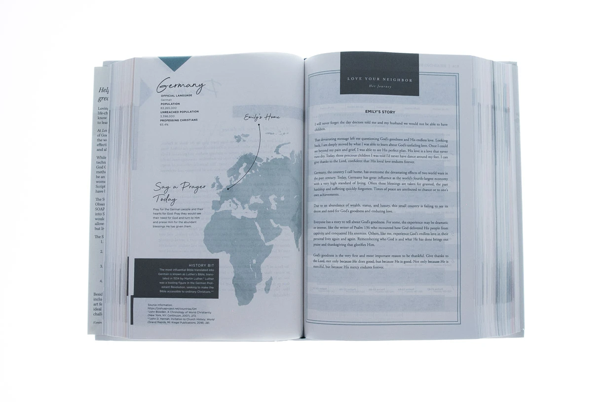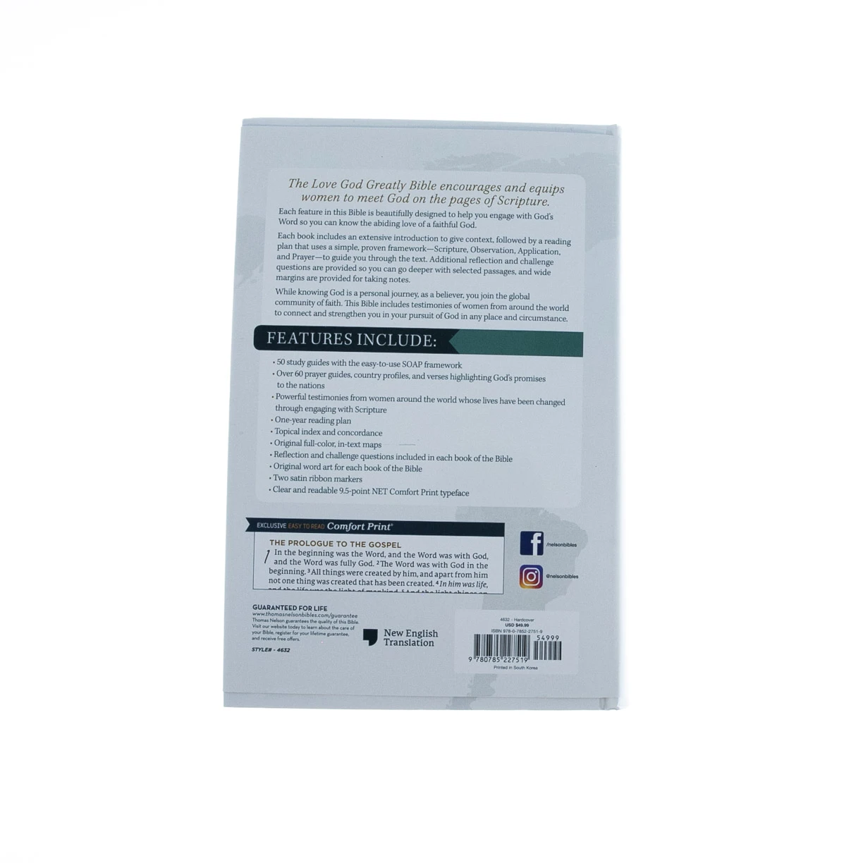 The Love God Greatly Bible encourages and equips women to meet God on the pages of Scripture. Each feature in this Bible is beautifully designed to help you engage with God’s Word so you can know the abiding love of a faithful God.Each book includes an extensive introduction to give context, followed by a reading plan that uses a simple, proven framework—Scripture, Observation, Application, and Prayer—to guide you through the text. Additional reflection and challenge questions are provided to go deeper on particular passages, and wide margins are provided for taking notes.While knowing God is a personal journey, as a believer, you join the global community of faith. This Bible includes testimonies of women from around the world to connect and strengthen you in your pursuit of God in any place and circumstance.Features include:Thomas Nelson’s exclusive NET Comfort Print® typefaceOver 60 country profiles with nation-specific prayer guides, plus verses highlighting God’s promises to the nationsPowerful testimonies from women around the world whose lives have been changed through engaging with ScriptureMore than 150 devotionals and memory verse list for deeper reflection50 reading plansOne-year reading planTopical index, and original full-color, in-text mapsReflection and challenge questions included in each book of the BibleOriginal word art for each book of the BibleTwo satin ribbon markers9.5-point print size