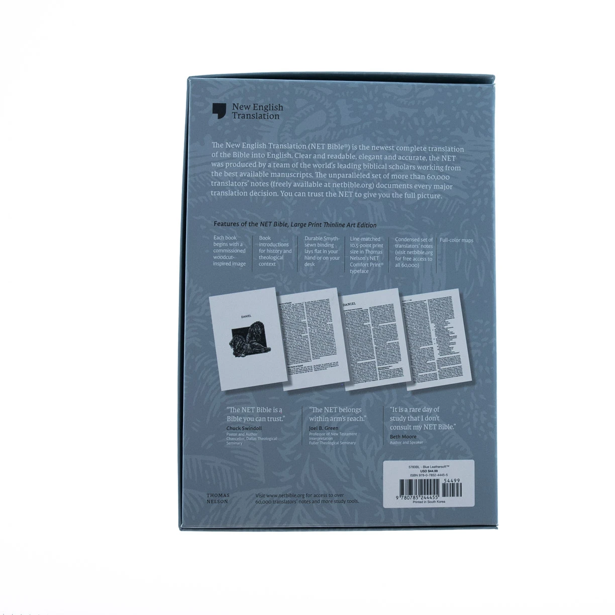 This NET Thinline Large Print Art Edition begins each Bible book with a commissioned woodcut-inspired image to reflect the underlying themes, followed by an introduction to enrich your reading with details about the historical and theological context. Clear and readable, elegant and accurate, the New English Translation (NET) was produced by a team of the world’s leading biblical scholars who began work on the project in 1995 and working from the best available manuscripts. The unparalleled set of translator’s notes, freely available at netbible.org, documents every major translation decision. You can trust the NET to give you the full picture. Features include: Commissioned artwork and a brief introduction lead into each book of the Bible Concise set of NET translator notes The New English Translation, known to be a trusted, readable, and accurate Bible translation for the 21st century Full-color maps Gilded page edges Traditional sewn binding for flexibility and durability Two satin ribbons Exclusive Thomas Nelson NET Comfort Print® in line-matched 10.5-point type