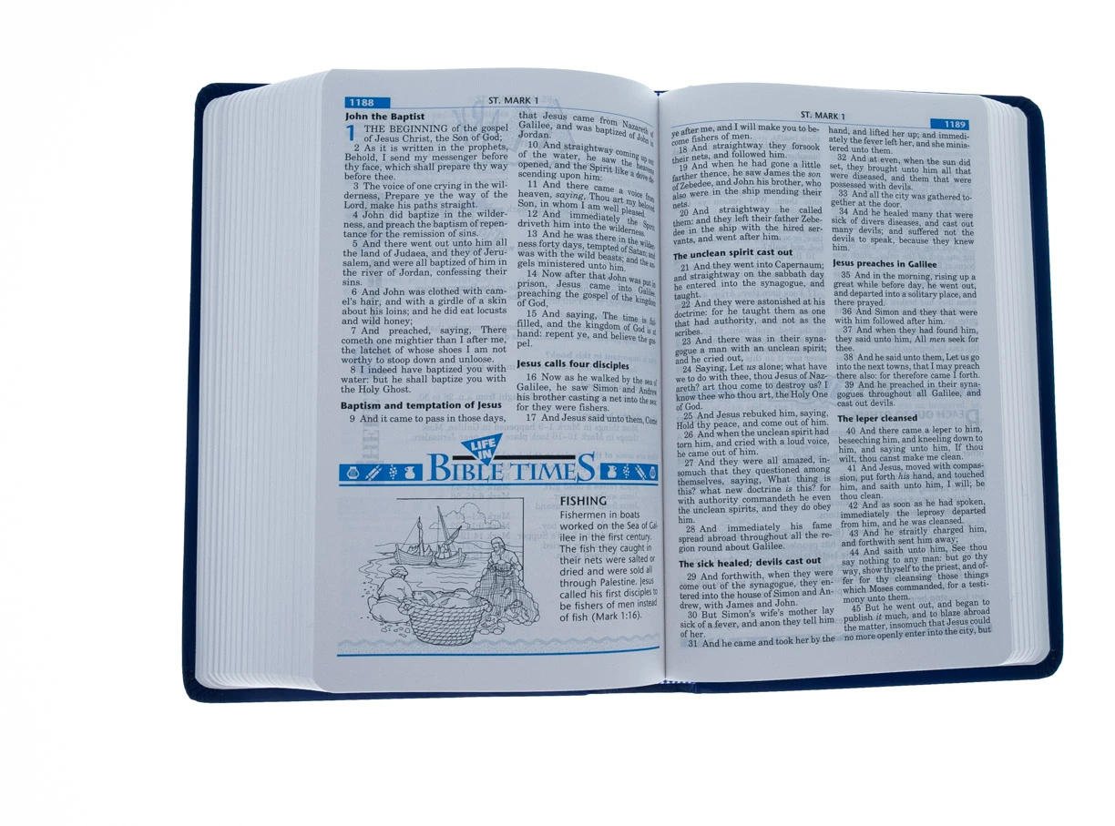 Features include: “Did You Know?” reveals fascinating facts in the Bible; “Life in Bible Times” brings the Bible alive with descriptions and pictures; “Let’s Live It!” shows you how to apply the Bible to your life today; “Words to Remember” helps you remember important Bible verses; Dictionary/concordance explains key words and helps you find important Bible passages; Book introductions explain each Bible book; 8 color maps show you where it all happened; Complete King James Version of the Bible, a timeless treasure and traditional favorite. Ideal for home, school or church, The King James Version Kids Study Bible sweeps you off on a fun and captivating quest: knowing God.